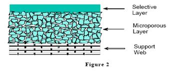 常用的复合膜构造如图所示,复合膜主要有三层结构,最下层由无纺布或织布制成,主要提供机械支撑以适应工作压力,中间层由多孔高分子构成,主要功能是提供气体流道并对极薄的选择层进行支撑,选择层可以是玻璃态或橡胶态的高分子材料或分子筛,真正的分离过程发生在极薄的选择层内。选择层厚度通常为0.1---10um。