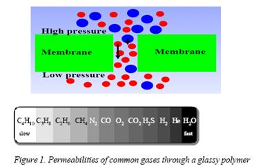 分离膜由多孔玻璃态高分子材料制成。利用混合组份不同气体的分子直径大小不同,在分压差驱动下通过膜中微孔是透过速度不同,小分子组份优先通过膜,而大分子组份难于通过从而将不同组份分开,下面给出不同组份在玻璃态高分子膜的透过速度比较。