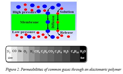气体分子在膜的高压侧溶解于膜中,并在膜的两侧分压差驱动下在膜中扩散,并从低压侧脱逸。溶解/扩散膜利用不同组份在膜材料中溶解/扩散的速度具有很大差异,从而将各组份分离。以硅橡胶膜为例,图2. 给出了不同组份在压为驱动下在膜中溶解/扩散而透过的速度差异。